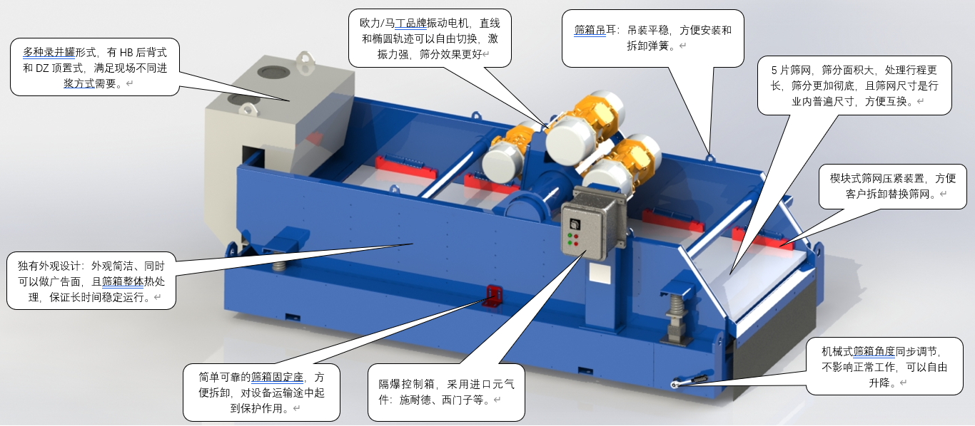 北鉆固控高頻干燥振動(dòng)篩是結(jié)合國(guó)內(nèi)外泥漿不落地市場(chǎng)需求及環(huán)保領(lǐng)域的要求自主研發(fā)的一款高激振強(qiáng)度的泥漿振動(dòng)篩,高頻干燥振動(dòng)篩能夠滿足各種鉆屑廢棄物脫水、篩分、凈化等要求。高頻干燥振動(dòng)篩是保證整個(gè)鉆屑尾漿處理持續(xù)有效進(jìn)行的必不可少的重要設(shè)備,直接將鉆井過(guò)程中振動(dòng)篩、除砂器、除泥器排出的廢棄物進(jìn)行干燥處理,干燥后可實(shí)現(xiàn)固相干堆處理。北鉆高頻干燥振動(dòng)篩可根據(jù)客戶的不同處理要求進(jìn)行特殊設(shè)計(jì),以滿足國(guó)家對(duì)各類礦山,鉆探,水處理等工程的環(huán)保要求。 GBZS系列高頻干燥振動(dòng)篩技術(shù)參數(shù) 型號(hào) GBZS584 GBZS585/GBZS585S 振動(dòng)軌跡 直線型/雙軌跡 處理量 140m³/h 165m³/h 電機(jī)功率 2×2.2kW/2x2.2+1x1.3kW 篩網(wǎng)數(shù)量 4 5 篩網(wǎng)規(guī)格 585×1165mm 585×1165mm 激振強(qiáng)度 ≥8.0G 雙振幅 5.0~6.5mm 篩箱調(diào)節(jié)角度 -1°~4° 噪音 <85db 防爆標(biāo)準(zhǔn) ExdIIBt4/IECEX/A-TEX 重量 1530kg 1950kg 外形尺寸 3080×1960×1424mm 3597X1978X1415mm 備注 以上處理量供參考,依據(jù)不同的篩網(wǎng)目數(shù)和泥漿狀況會(huì)有不同。 GBZS系列干燥篩優(yōu)勢(shì)圖示 北鉆高頻干燥振動(dòng)篩的特點(diǎn)和優(yōu)勢(shì): 1.激振強(qiáng)度高達(dá)8.0G,而且可以調(diào)節(jié),能夠有效的干燥鉆屑; 2.篩箱整體熱處理,能夠滿足高激振強(qiáng)度下長(zhǎng)時(shí)間穩(wěn)定工作; 3.電控箱內(nèi)裝的熱繼電器有過(guò)載和缺相保護(hù)功能; 4.運(yùn)動(dòng)軌跡為直線型,振幅大,運(yùn)動(dòng)速度快,能快速的進(jìn)行固液分離; 5.漏斗式進(jìn)料方式的設(shè)計(jì),有效的降低了進(jìn)料高度,方便輸送機(jī)的進(jìn)料; 6.采用國(guó)際知名品牌振動(dòng)電機(jī),意大利OLI電機(jī)或者美國(guó)Martin電機(jī); 7.主要電器元件選用西門子,施耐德或者ABB等品牌;