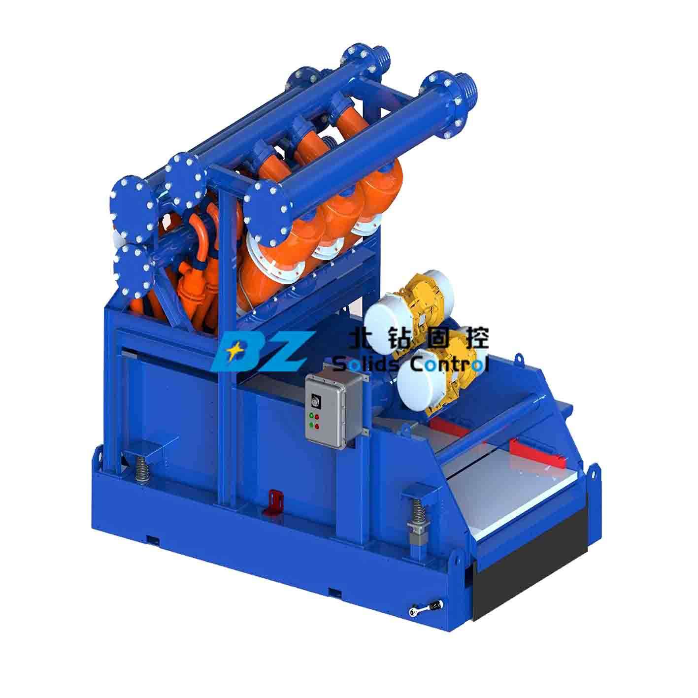除砂除泥一體機又稱泥漿清潔器,顧名思義就是將除砂器、除泥器、篩分功能綜合在一起的設備。泥漿清潔器在整套鉆井液固控系統中屬于二級凈化設備。 除砂除泥一體機在整個鉆井液固控系統中起到了承上啟下的作用,通過鉆井液泥漿清潔器上的聚氨酯旋流器將凈化設備——鉆井液振動篩處理過的泥漿再次分級處理,其次作用就是為離心機能高效的工作提供保障。 除砂除泥一體機在工作過程中,首先通過除砂旋流器將泥漿中所含的47~76um的固相顆粒進行旋流處理,將處理過的泥漿儲存在一個單獨的泥漿罐隔艙內,然后通過除泥旋流器對這部分泥漿再次凈化處理,分離出泥漿內15~47um的固相顆粒,J后將處理過的泥漿輸送給離心機進行精細的凈化處理。除砂、除泥旋流器分離出來的泥漿通過底流篩補充篩分以免造成浪費。 除砂除泥一體機在工作過程中還應有一臺除砂器供漿砂泵和一臺除泥器供漿砂泵提供動力保障。